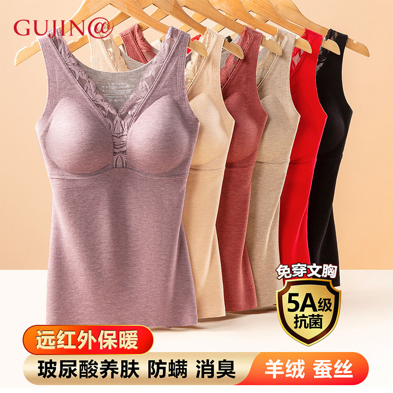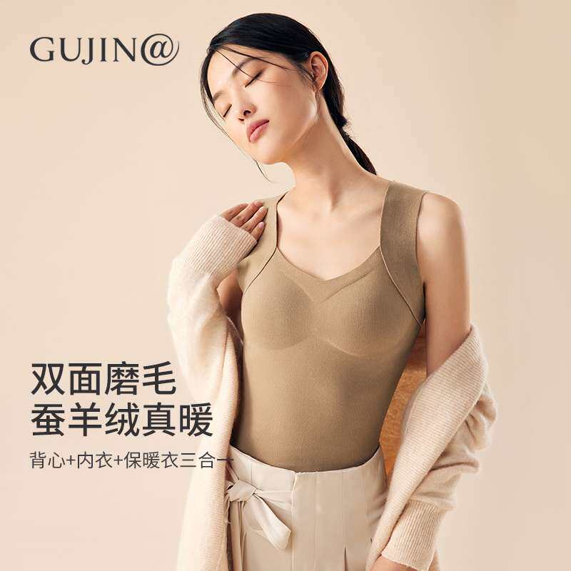 古今@保暖背心女带胸垫上衣蚕羊绒发热内衣美拉德打底女士保暖衣