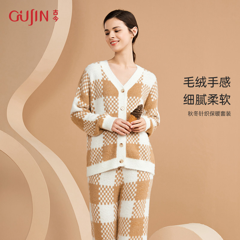 古今商场同款女士V领格子秋冬柔软针织开衫保暖套装7R630