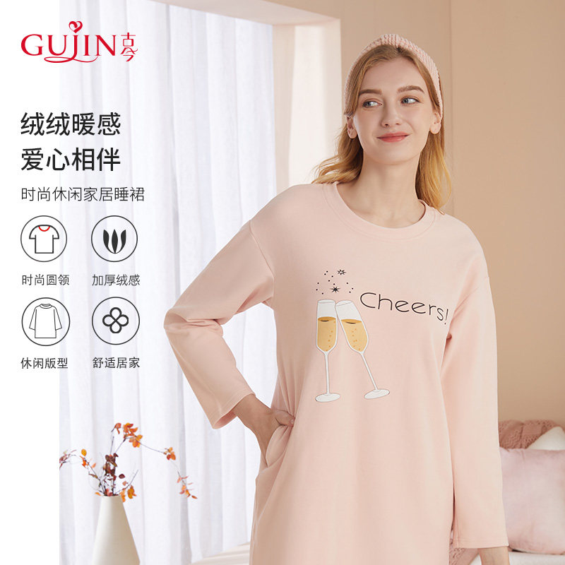 古今女士秋冬舒适保暖德绒长袖宽松圆领睡裙家居服睡衣7M729