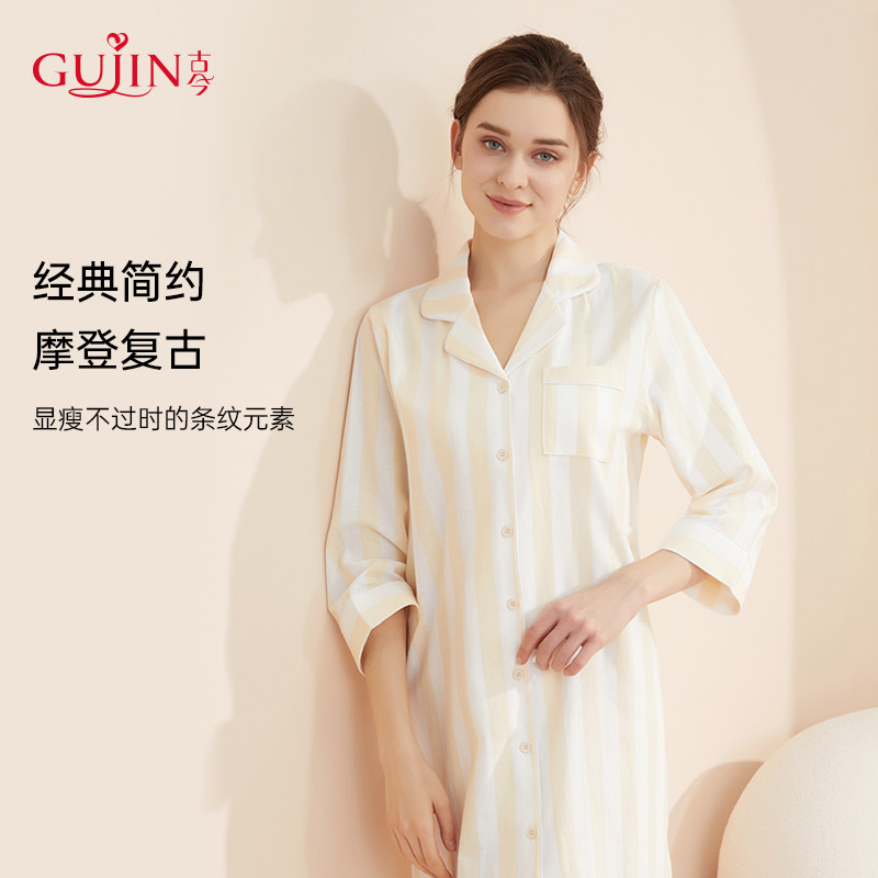 古今商场同款夏季七分袖时尚条纹元素小翻领棉质家居睡裙薄7P359