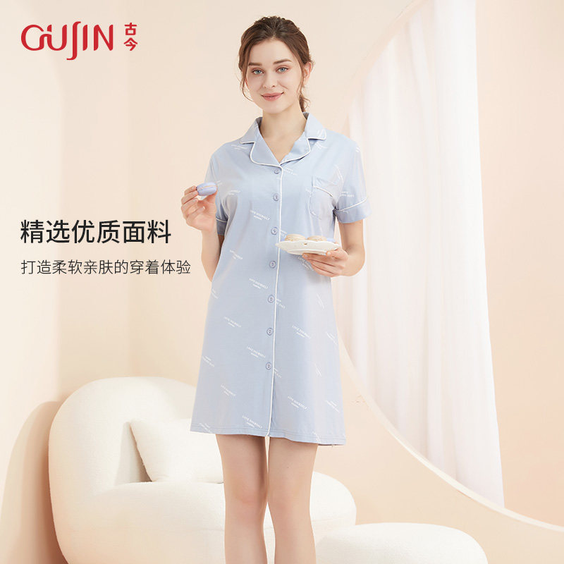 古今商场同款柔软透气夏季薄款睡裙简约纯色翻领开衫家居服7P360