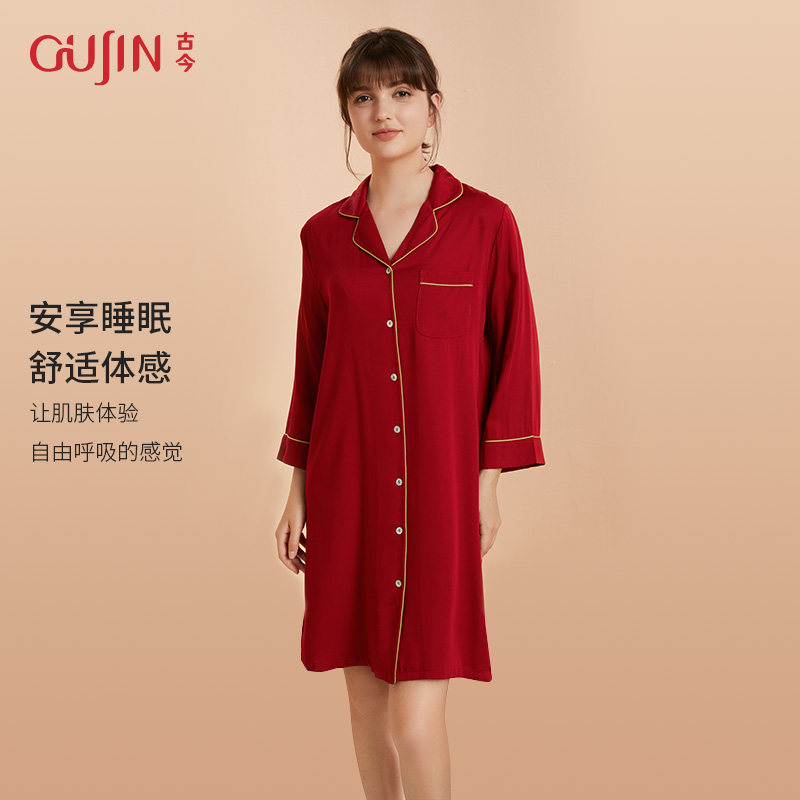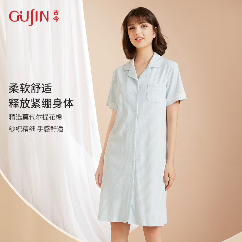 古今商场同款夏季莫代尔舒适透气薄款小翻领短袖家居服睡裙7P355