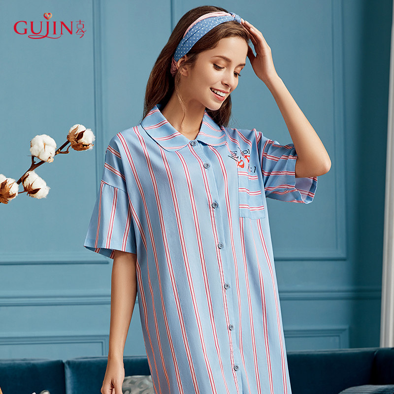 古今夏季薄款条纹元素衬衫领宽松款垂顺显瘦女休闲家居睡裙7M366