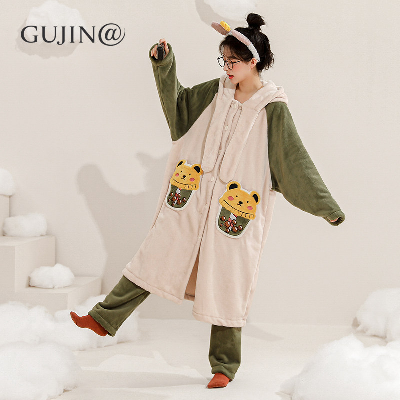 古今@女士睡衣冬季2023新款加绒法兰绒外穿睡裙纯棉加厚连帽睡袍