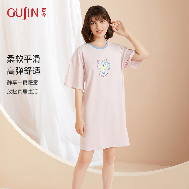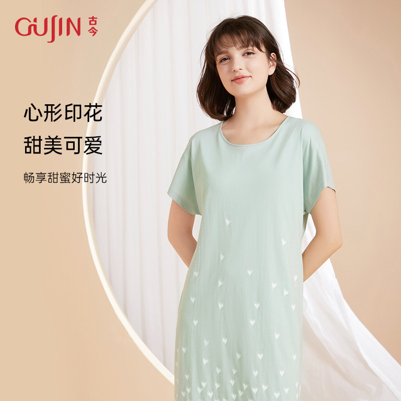 古今商场同款夏季心型印花圆领家居服舒适透气棉质短袖睡裙7P353