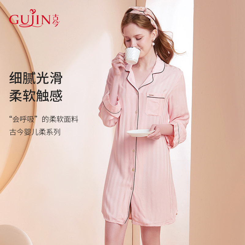 古今薄款简约时尚条纹宽松休闲透气家居衬衫睡裙女7M364