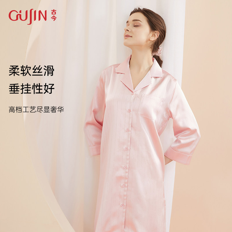 古今商场同款夏季柔软丝滑七分袖细条纹显瘦翻领家居服睡裙7P361