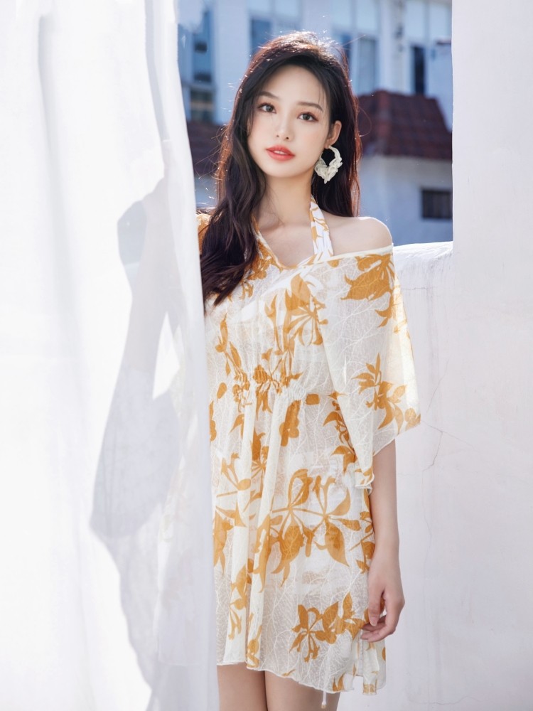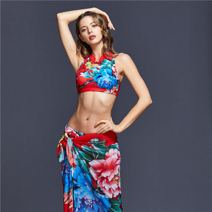 专柜号手品牌中国风复古旗袍泳衣女式比基尼三件套纱巾裙海边度假