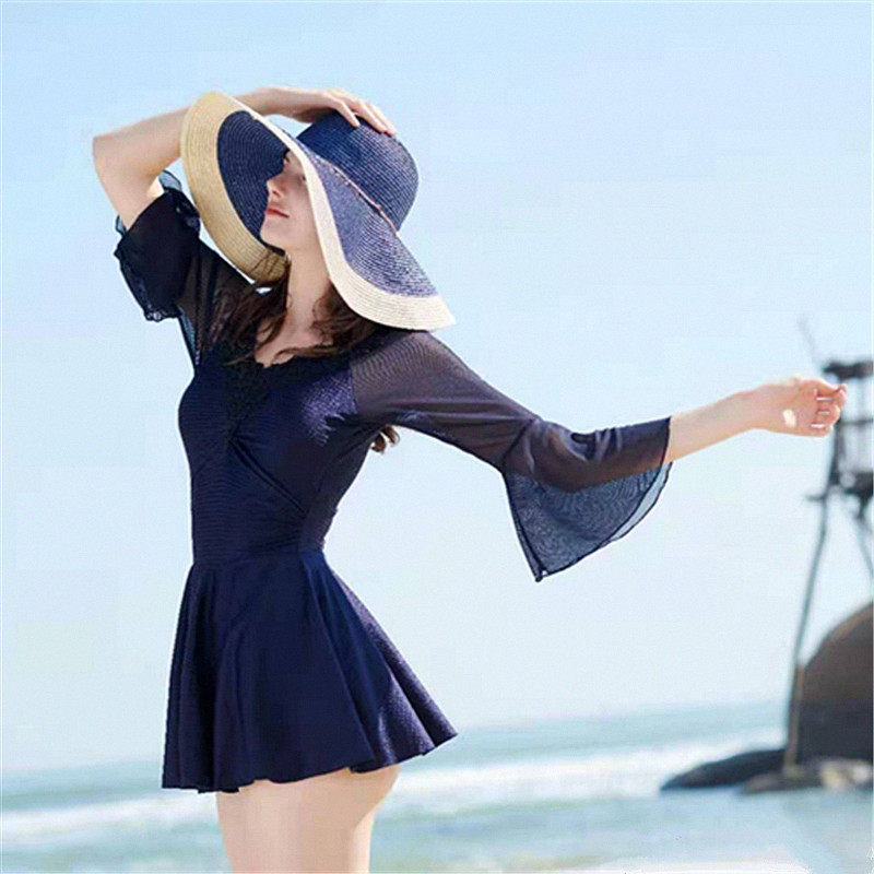 2021新款正品号手品牌水波纹七分长袖显瘦连体裙式女大码温泉泳衣