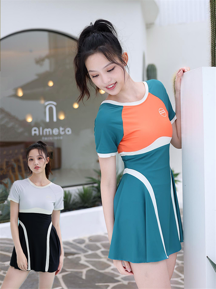 新款时尚拼色经典运动裙式连体泳衣短袖显瘦修身微胖2023正品号手