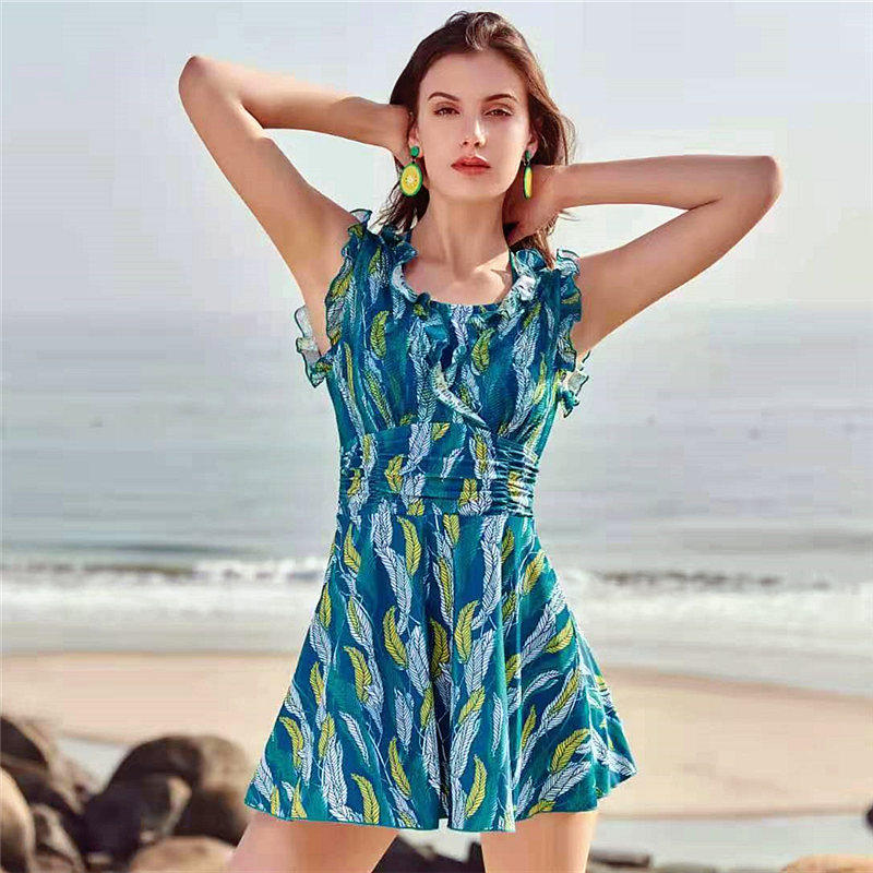 2019新款正品号手荷叶短袖遮手臂平角裙式连体泳衣女显瘦保守温泉