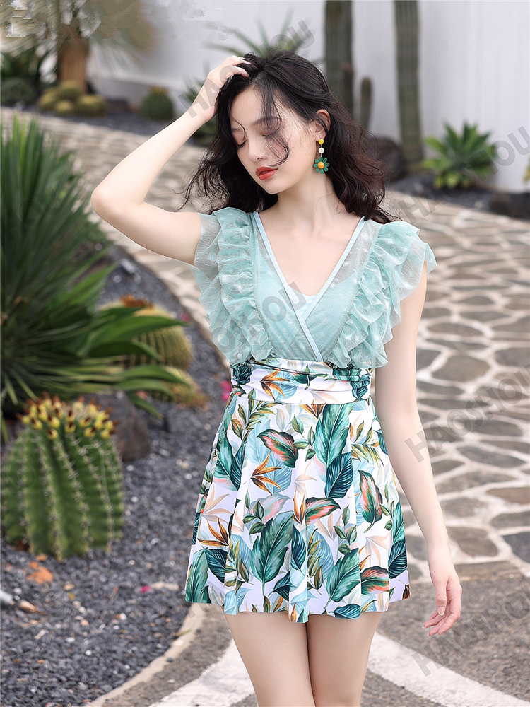 2023新款正品号手花边荷叶袖连体裙高腰遮肚显瘦泳衣女胖mm加大码