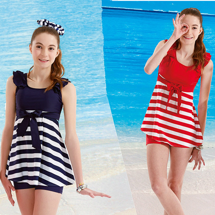 2021新款号手品牌条纹少女海军风保守短袖温泉泳衣女连体裙式大码