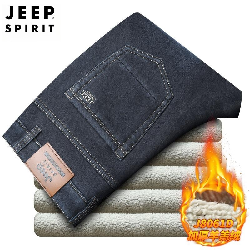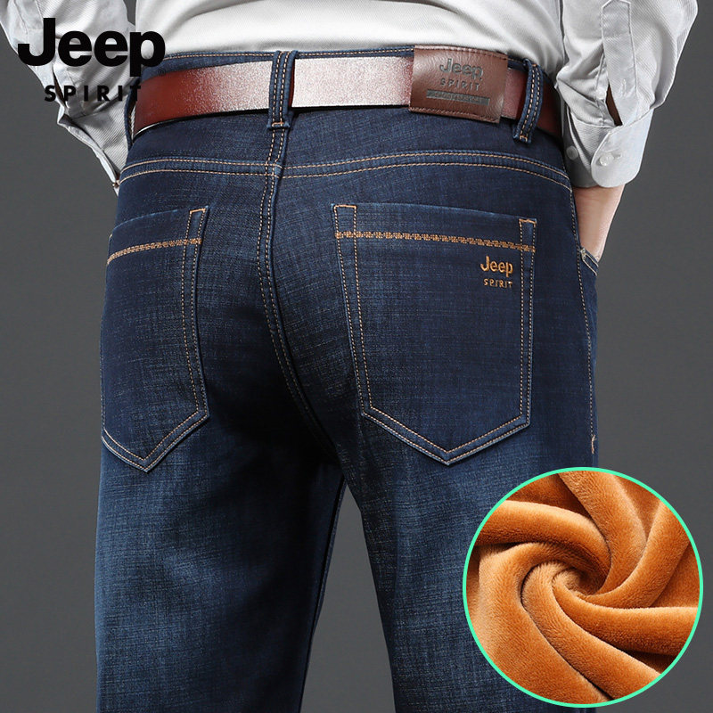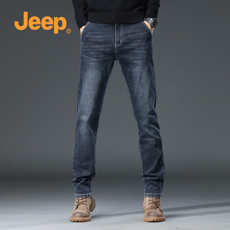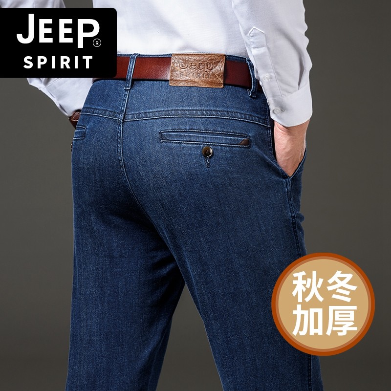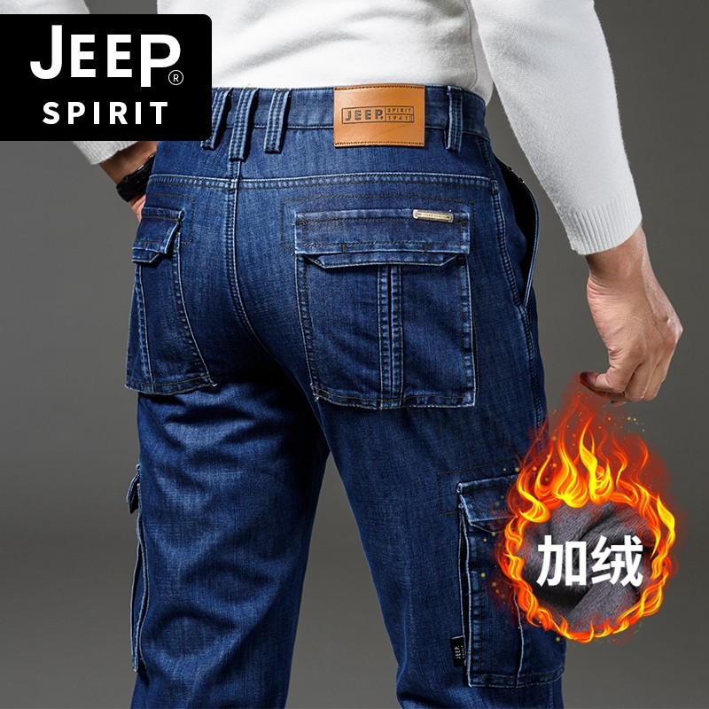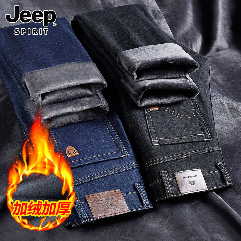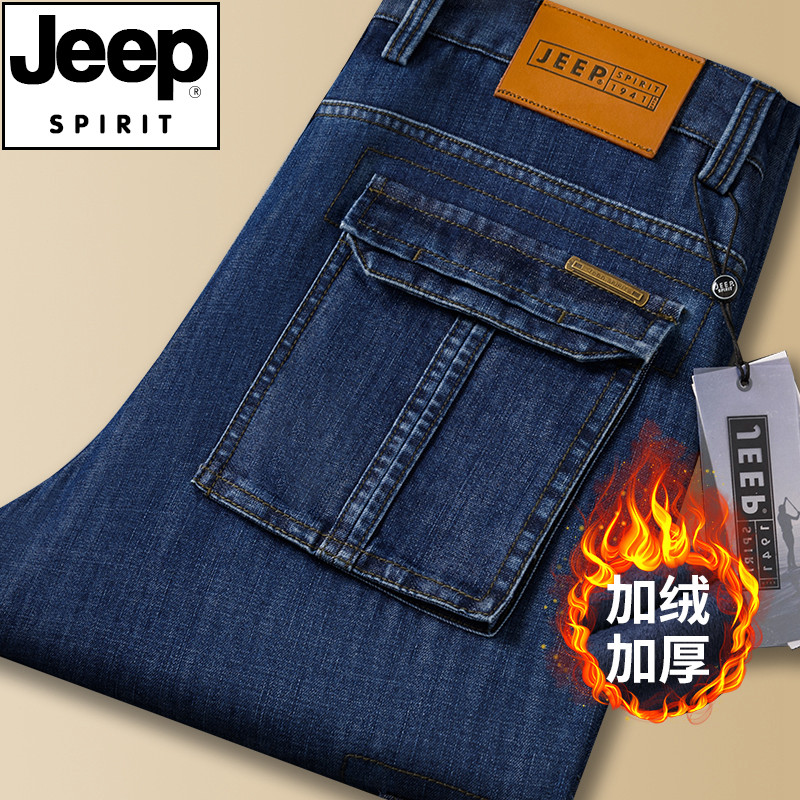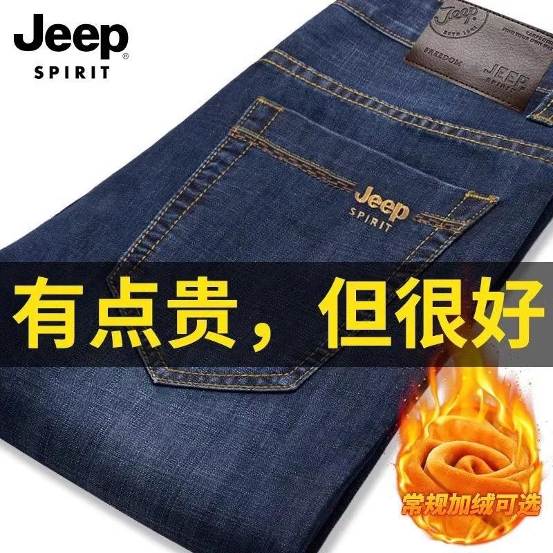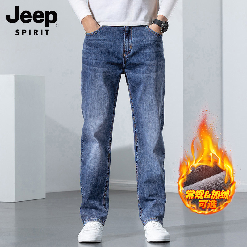 Jeep吉普牛仔裤男秋冬季加绒士宽松直筒大码弹力高端加厚长裤子新