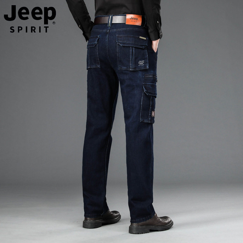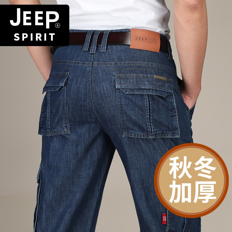 JEEP吉普秋冬厚款多口袋牛仔裤男士户外工装裤宽松直筒牛仔长裤子