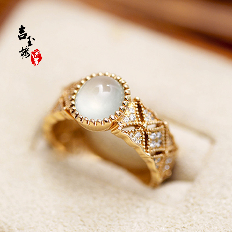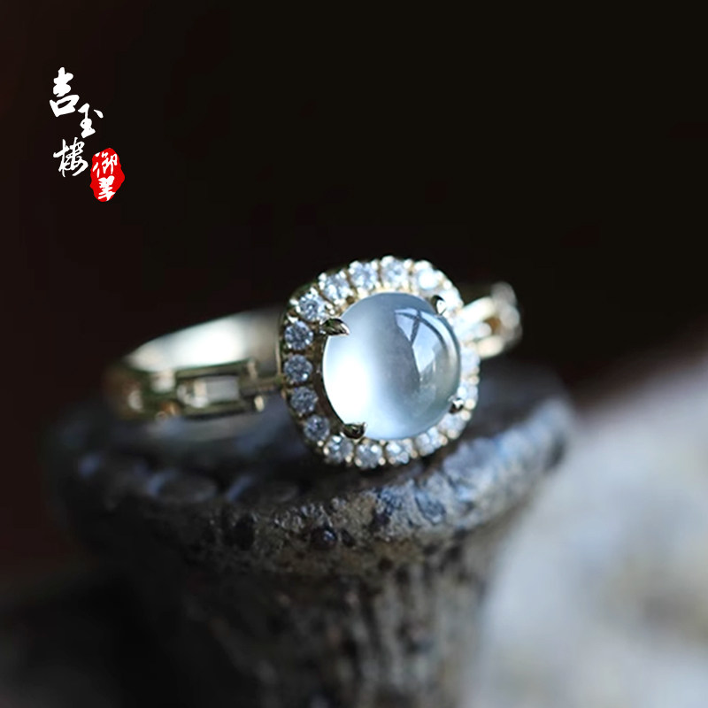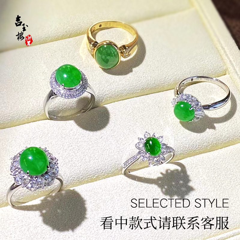 吉玉楼御翠缅甸A货冰种翡翠戒指18K金镶嵌天然玉石蛋面女戒指成品