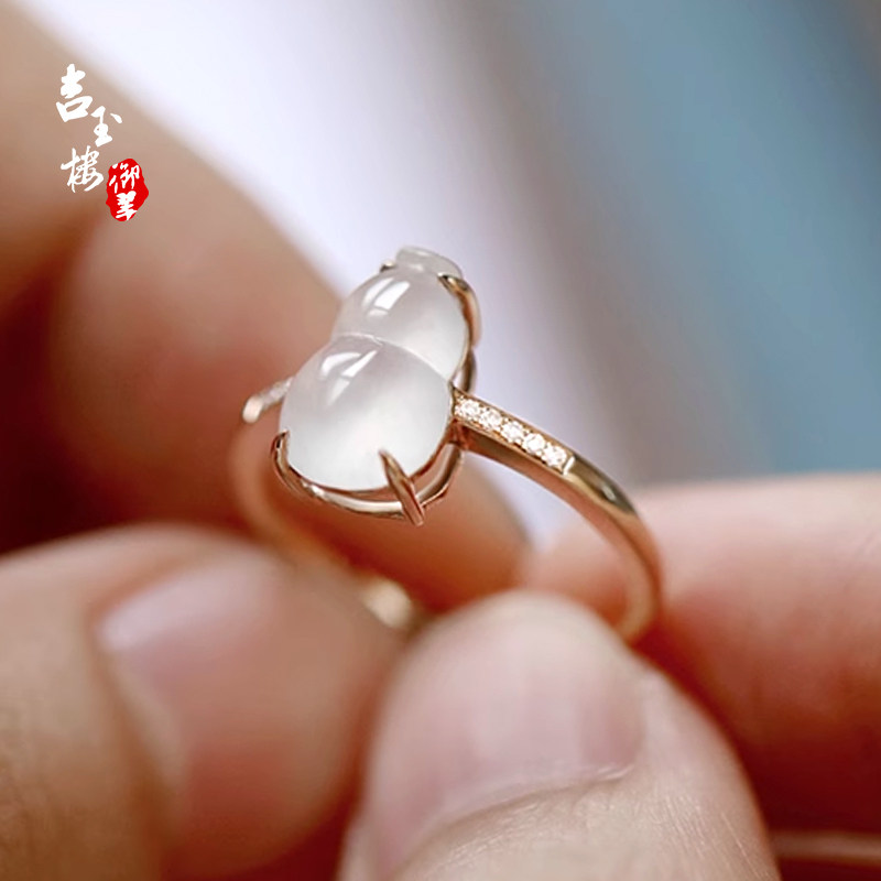 吉玉楼御翠天然缅甸A货冰种翡翠葫芦戒指18K金镶嵌钻石玉石戒面女