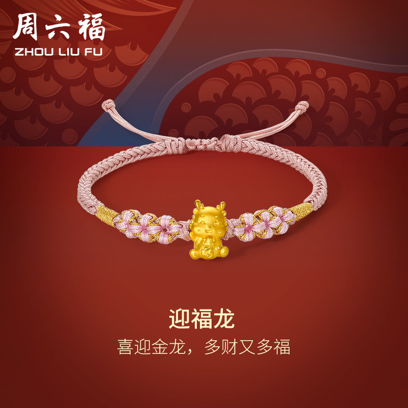 周六福黄金手绳多金龙编绳粉红绳手链定价足金本命年生肖新年礼物