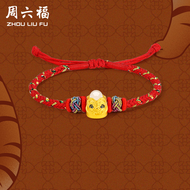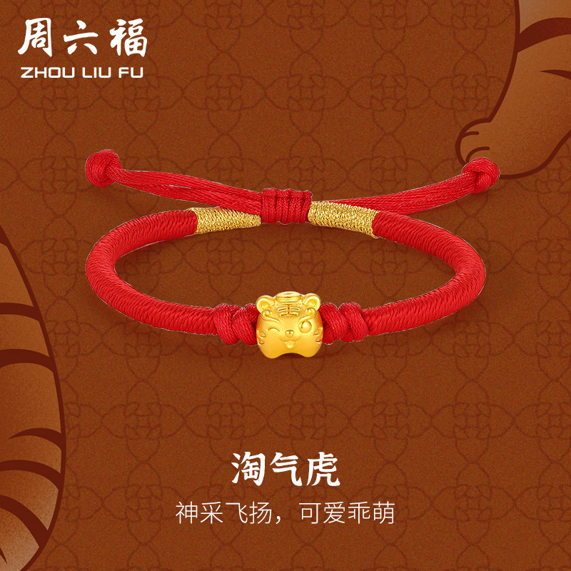 周六福珠宝黄金手链男女3D硬金淘气虎红绳转运生肖手饰本命年足金