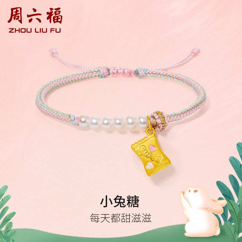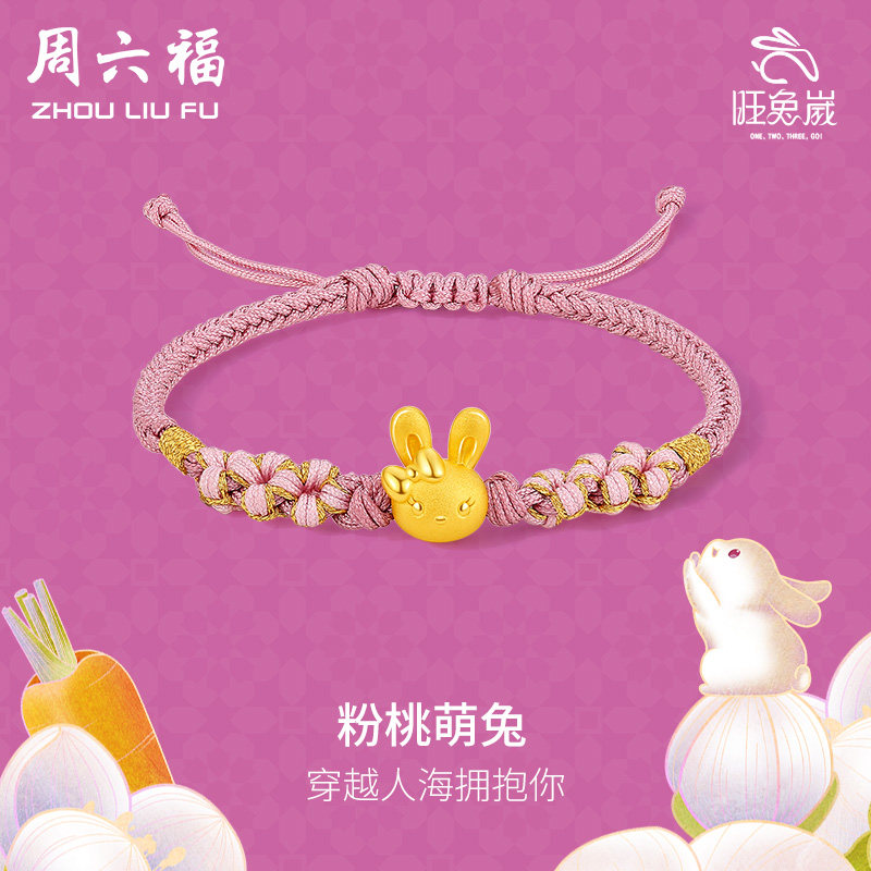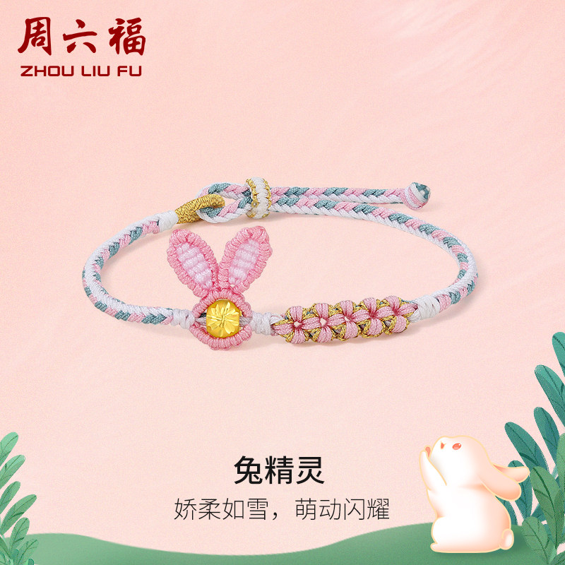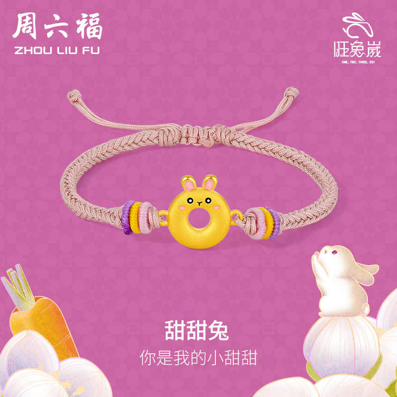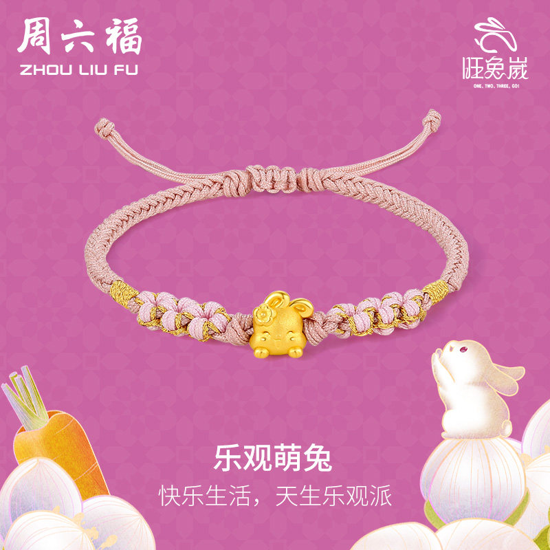 周六福黄金手绳足金生肖兔子定价糖果兔手链编织绳本命年新年礼物