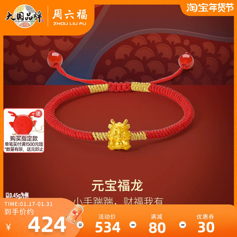 周六福黄金手绳元宝福龙编织红绳手链定价足金本命年生肖新年礼物