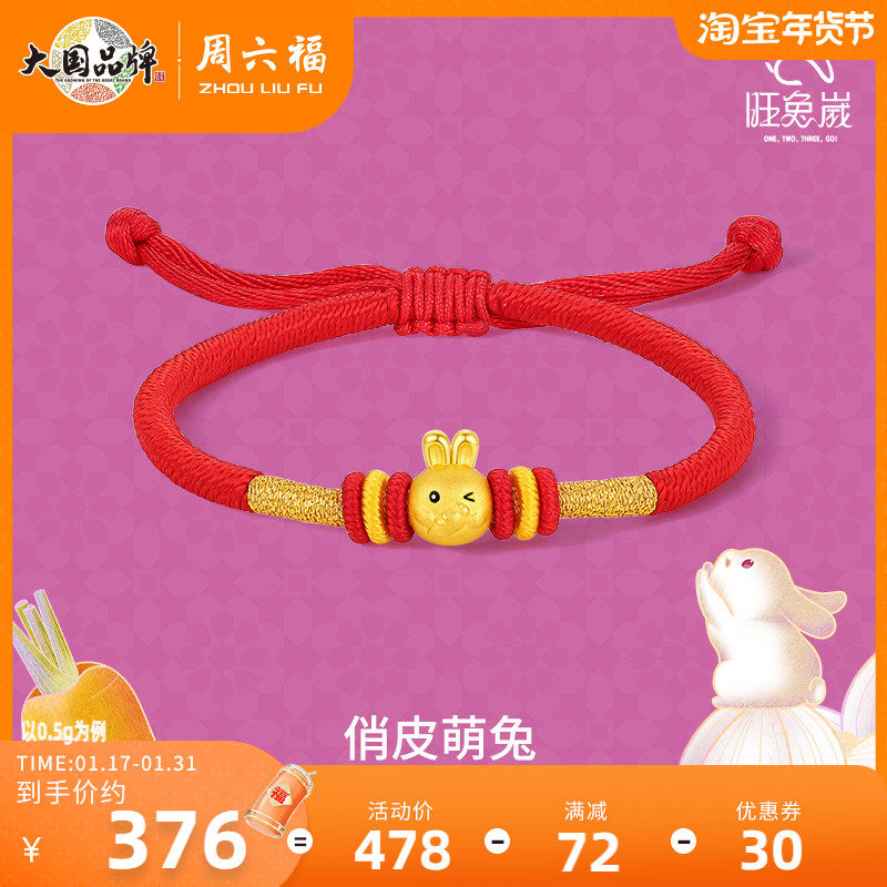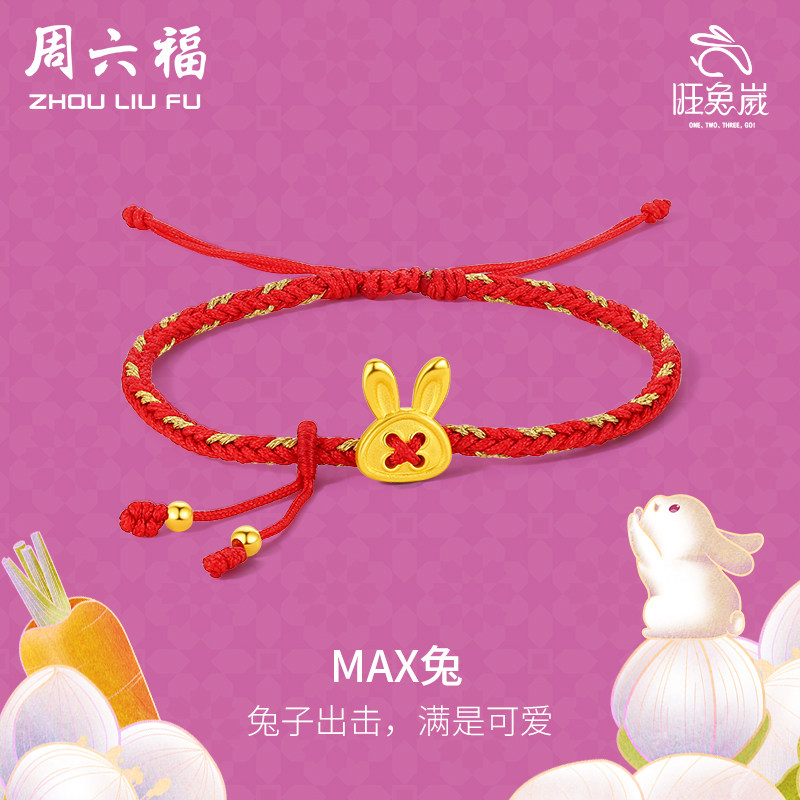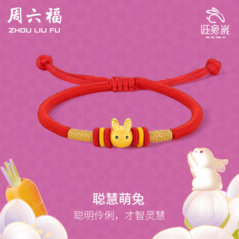 周六福黄金手绳生肖福袋兔子定价本命年编织红绳手链金饰新年礼物