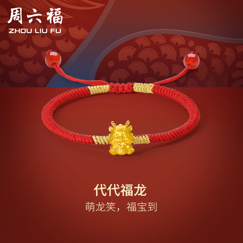 周六福黄金手绳五福龙编绳红绳手链定价足金本命年生肖龙新年礼物