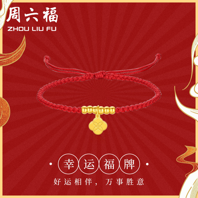 周六福黄金手链女幸运四叶草福牌本命年红绳转运计价足金新年礼物