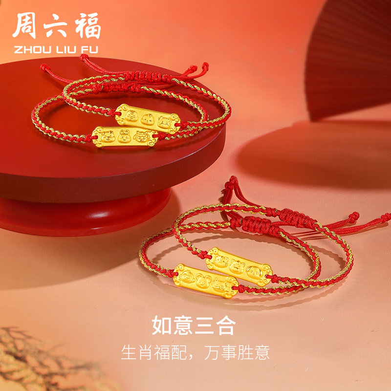 周六福黄金手绳足金生肖兔子定价如意编织红绳手链本命年新年礼物