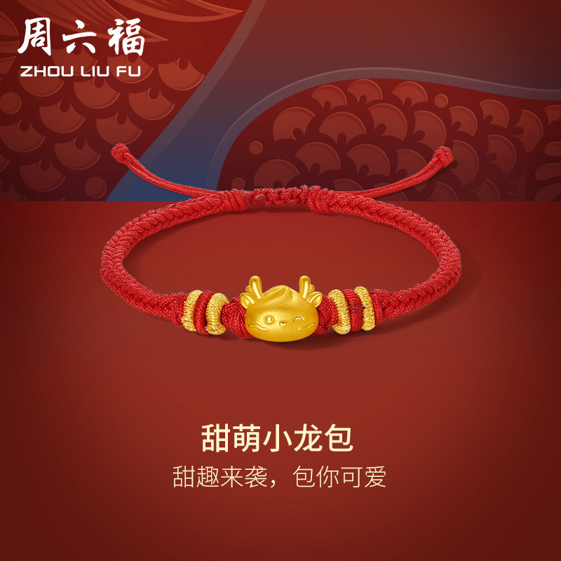 周六福黄金手绳小龙包编织红绳手链定价足金本命年生肖龙新年礼物