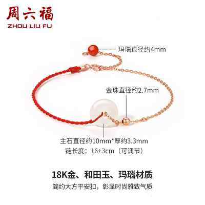 周六福18K金和田玉手链女岁岁平安扣金镶玉玛瑙本命年红绳正品