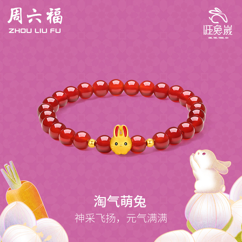 周六福黄金手串生肖萌兔转运珠手链女足金玛瑙串珠定价情人节礼物