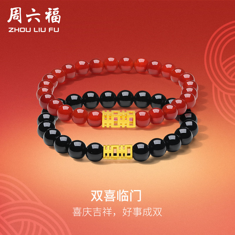 周六福黄金手串双喜临门手链男女足金红黑玛瑙串珠定价情人节礼物
