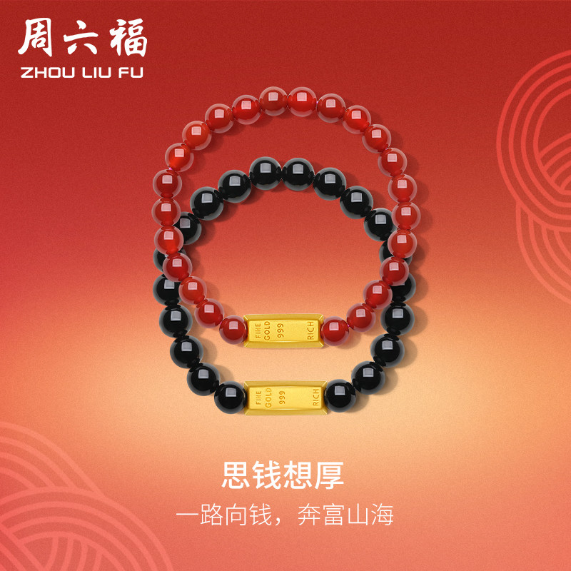 周六福黄金手串思钱想厚手链男女足金红黑玛瑙串珠定价情人节礼物