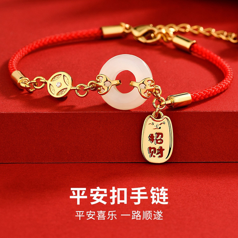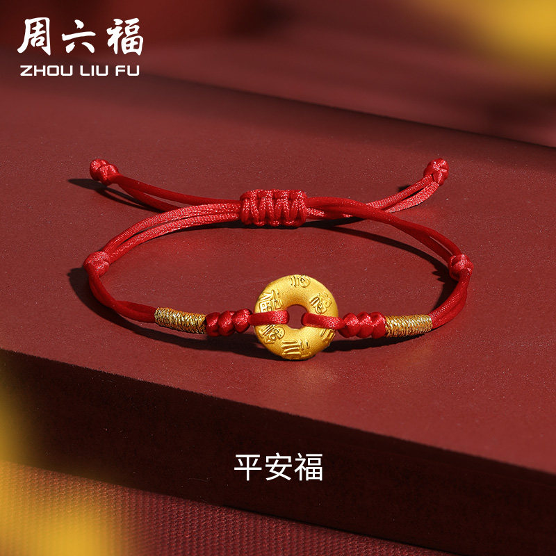 周六福和田玉手绳黄金足金平安扣手链女金镶玉红编绳情人节礼物