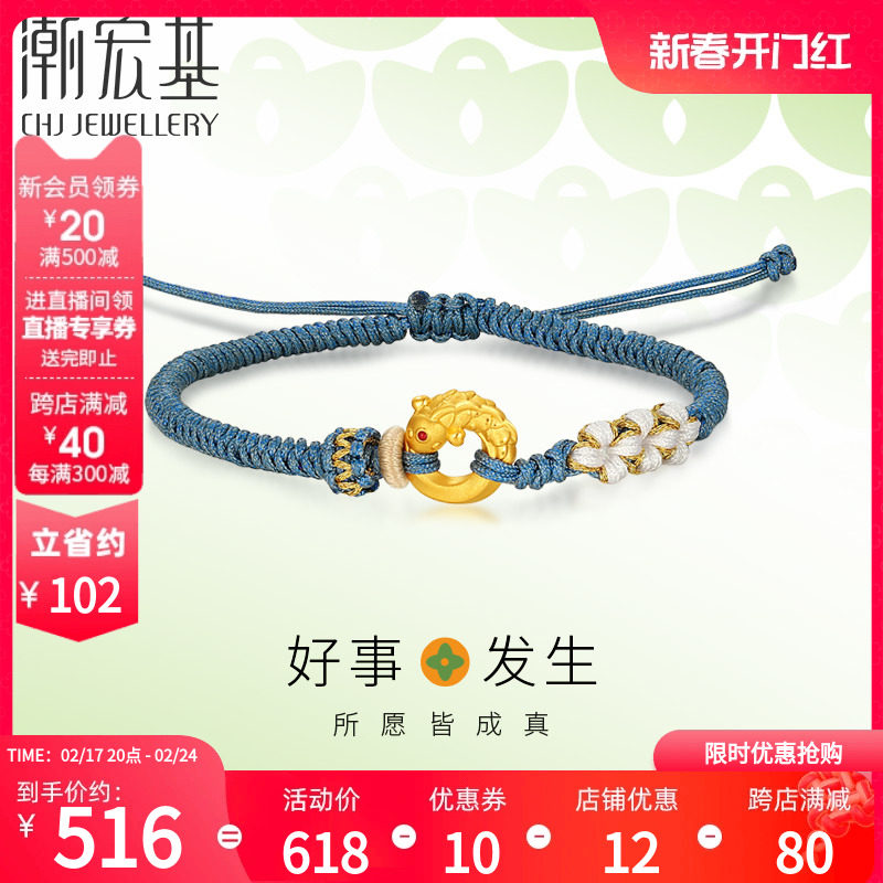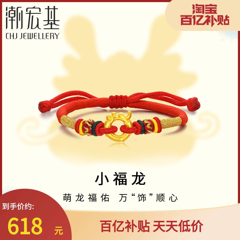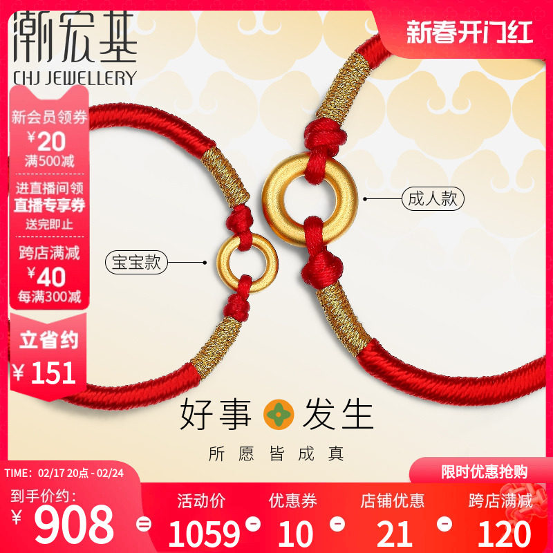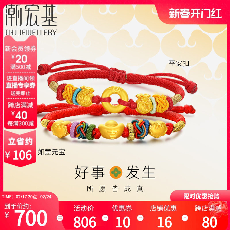 潮宏基好事发生黄金手链平安扣5D硬金足金手绳宝宝周岁满月礼物