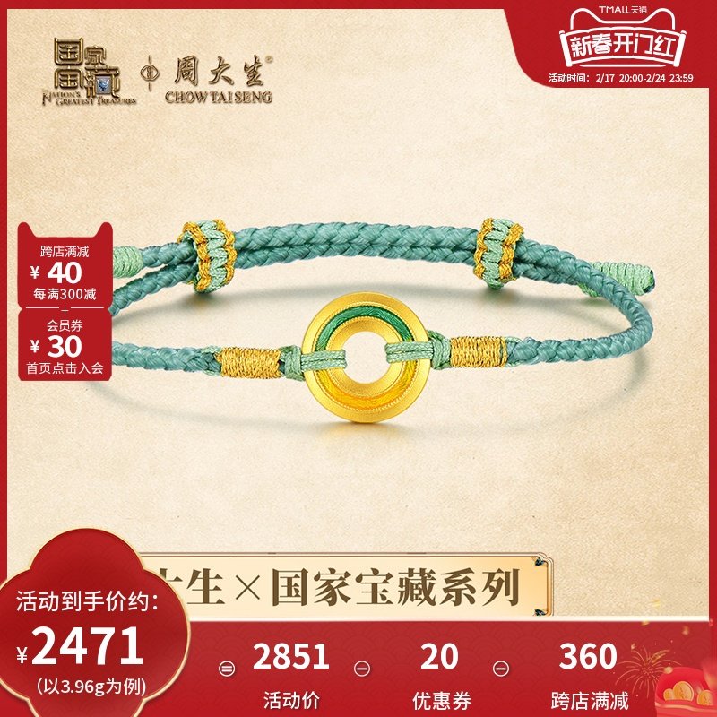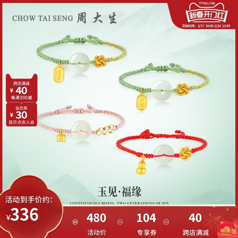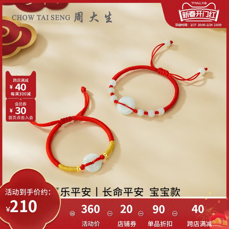 周大生黄金翡翠宝宝手绳平安扣金珠红绳手链平安喜乐周岁新年礼物