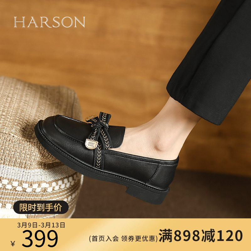 哈森秋季新品麦穗蝴蝶结深口单鞋英伦乐福鞋小皮鞋hws230193