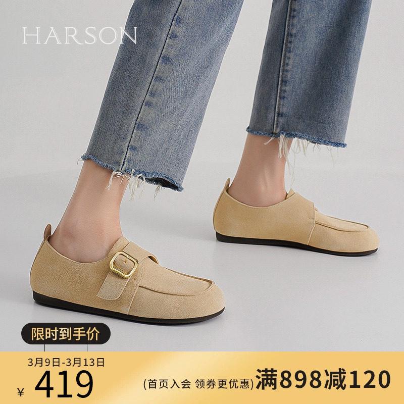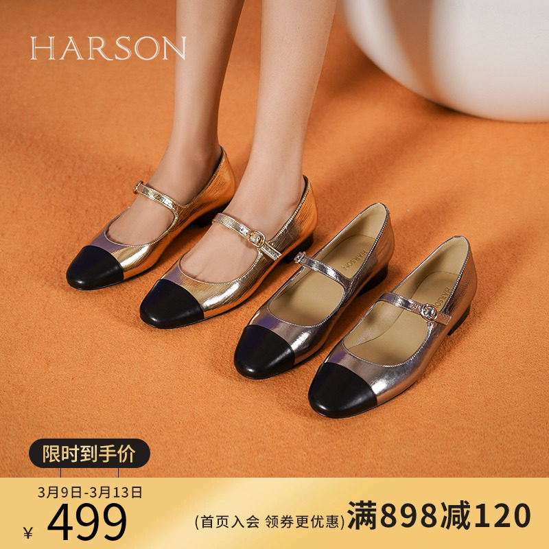 哈森单鞋女2024春季新款金属防踢鞋头软面低跟奶奶鞋HWS240183