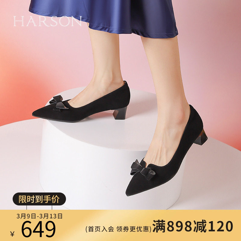 哈森单鞋2024年春季新款尖头通勤粗跟羊反绒蝴蝶结女鞋HWS240101