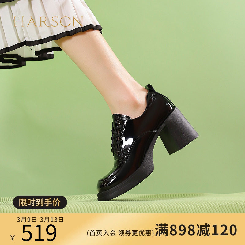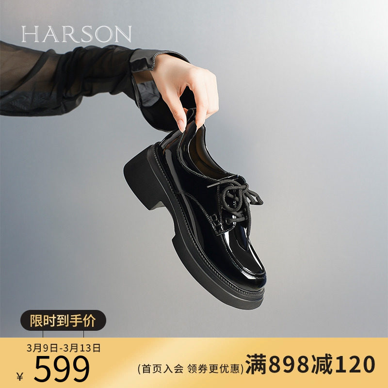 哈森春季新款黑色小皮鞋系带厚底深口单鞋黑色亮面女鞋HWL230142