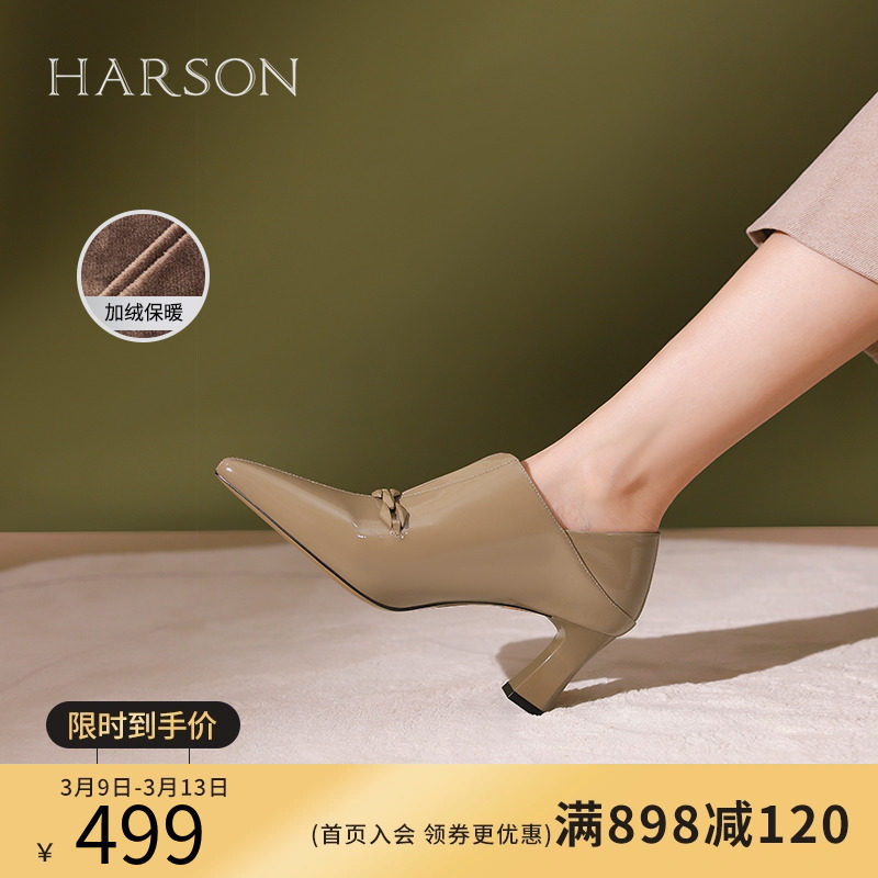 哈森深口单鞋女2024春季新款方头粗跟小皮鞋秋冬踝靴HWS240202