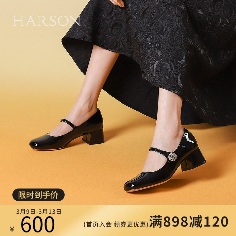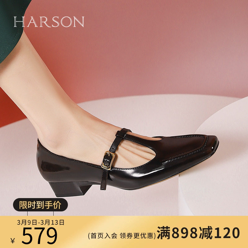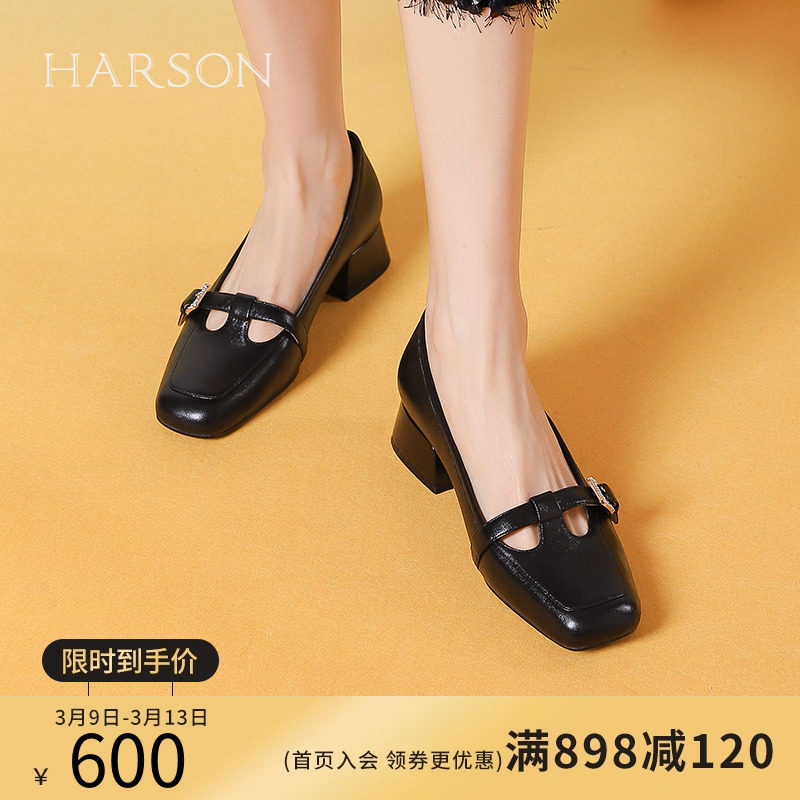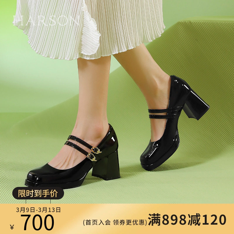 哈森玛丽珍女2024春季新款复古方头粗高跟单鞋女丁字鞋HWS240128