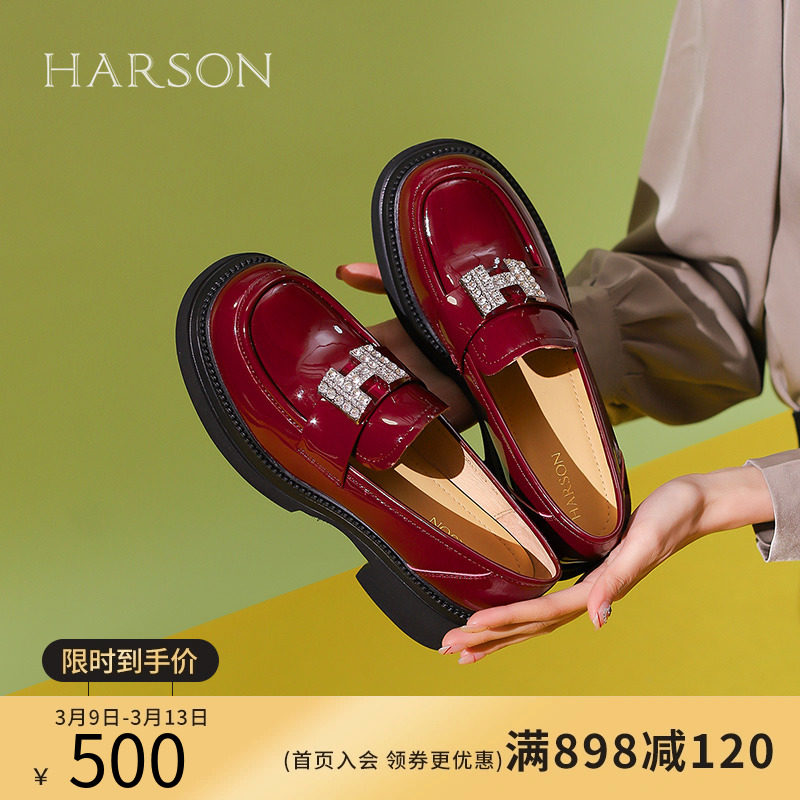 哈森乐福鞋女2024春季新款JK学院风水钻一脚蹬小皮鞋单鞋HS244105