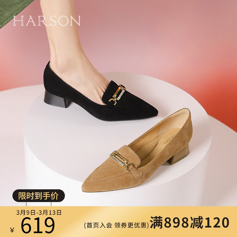哈森HARSON正品2022新款秋季中跟舒适圆头通勤乐福女单鞋HL227910