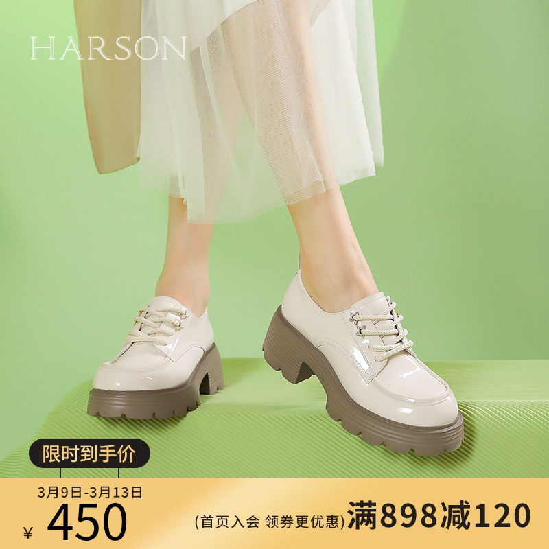 哈森亮面小皮鞋女春季新款系带厚底深口单鞋jk学院风女鞋HL232505