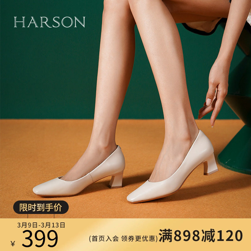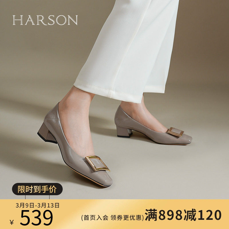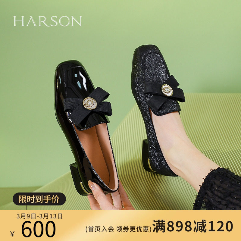 哈森春季新款粗跟方头气质单鞋女通勤百搭小皮鞋乐福鞋HWL230103