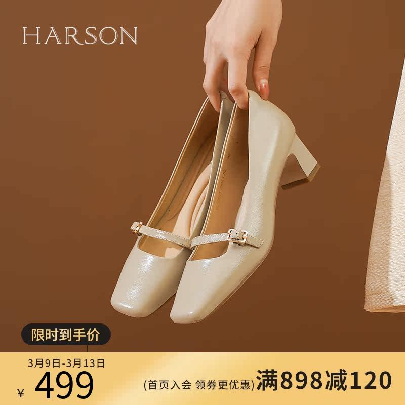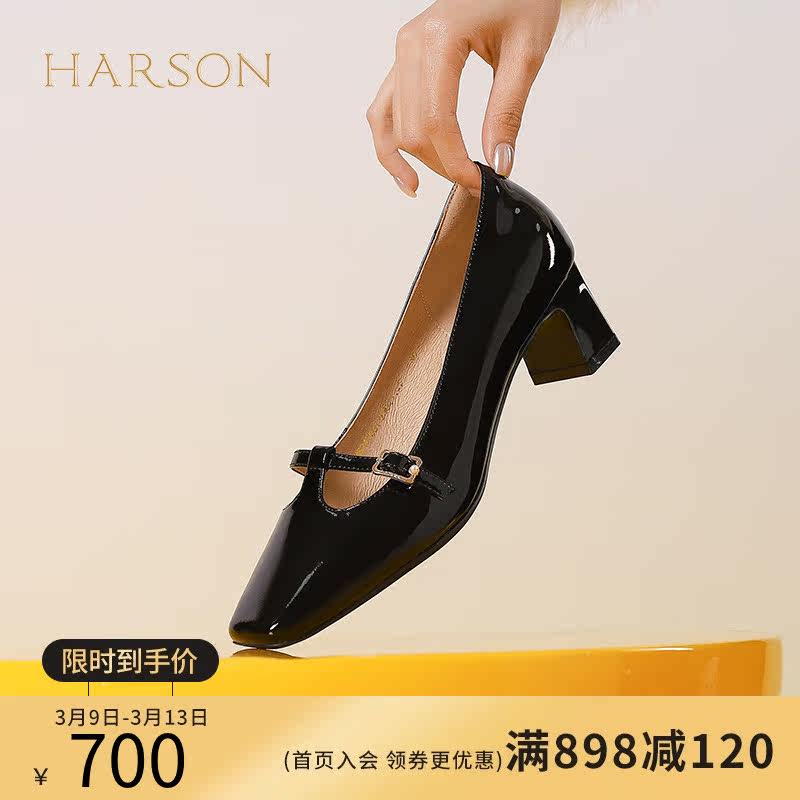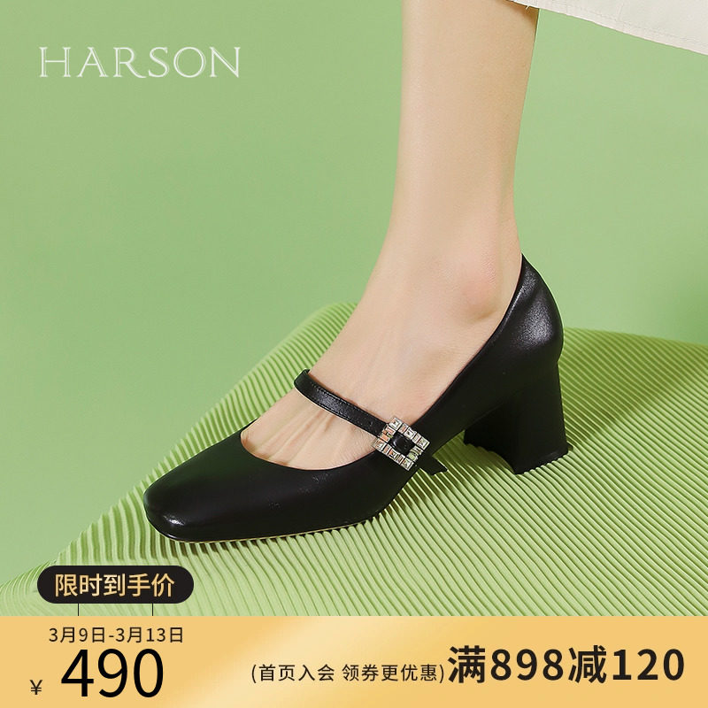哈森玛丽珍鞋子女2024春季新款方头粗跟显高浅口搭扣单鞋HS246010