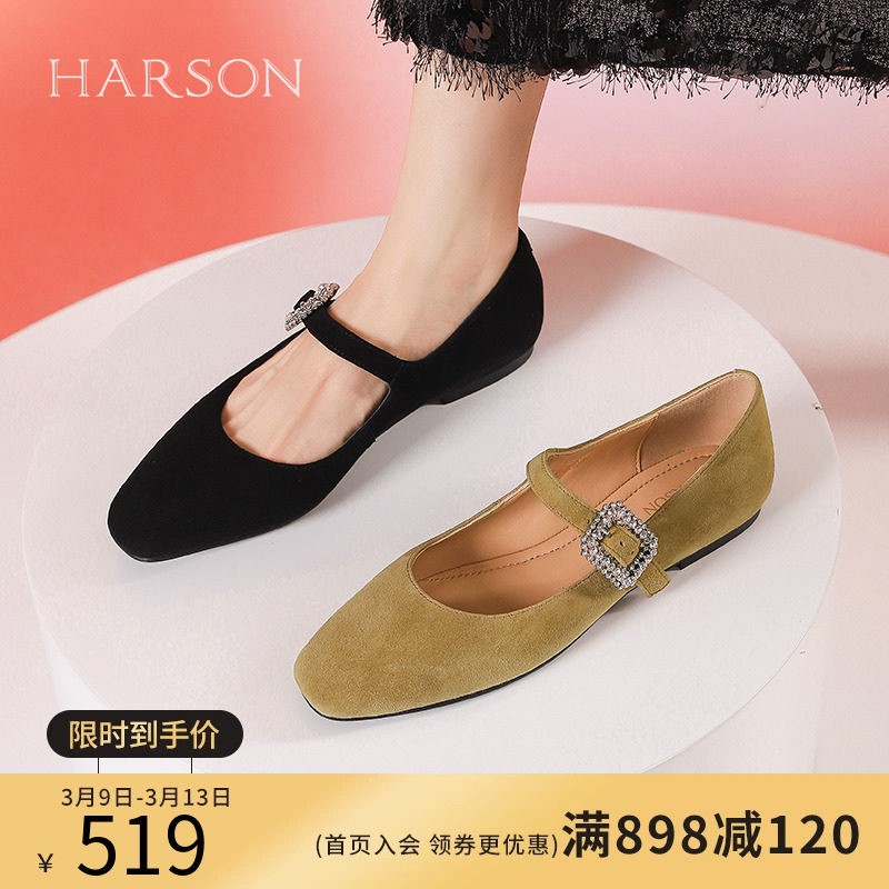 哈森丁字鞋女2024春季新款复古文艺方头玛丽珍浅口单鞋HWS240129