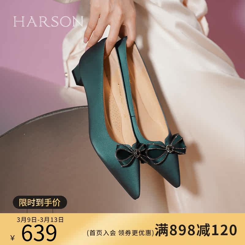 哈森春秋新款女鞋粗跟通勤尖头蝴蝶结晚晚风温柔单鞋女HS227815